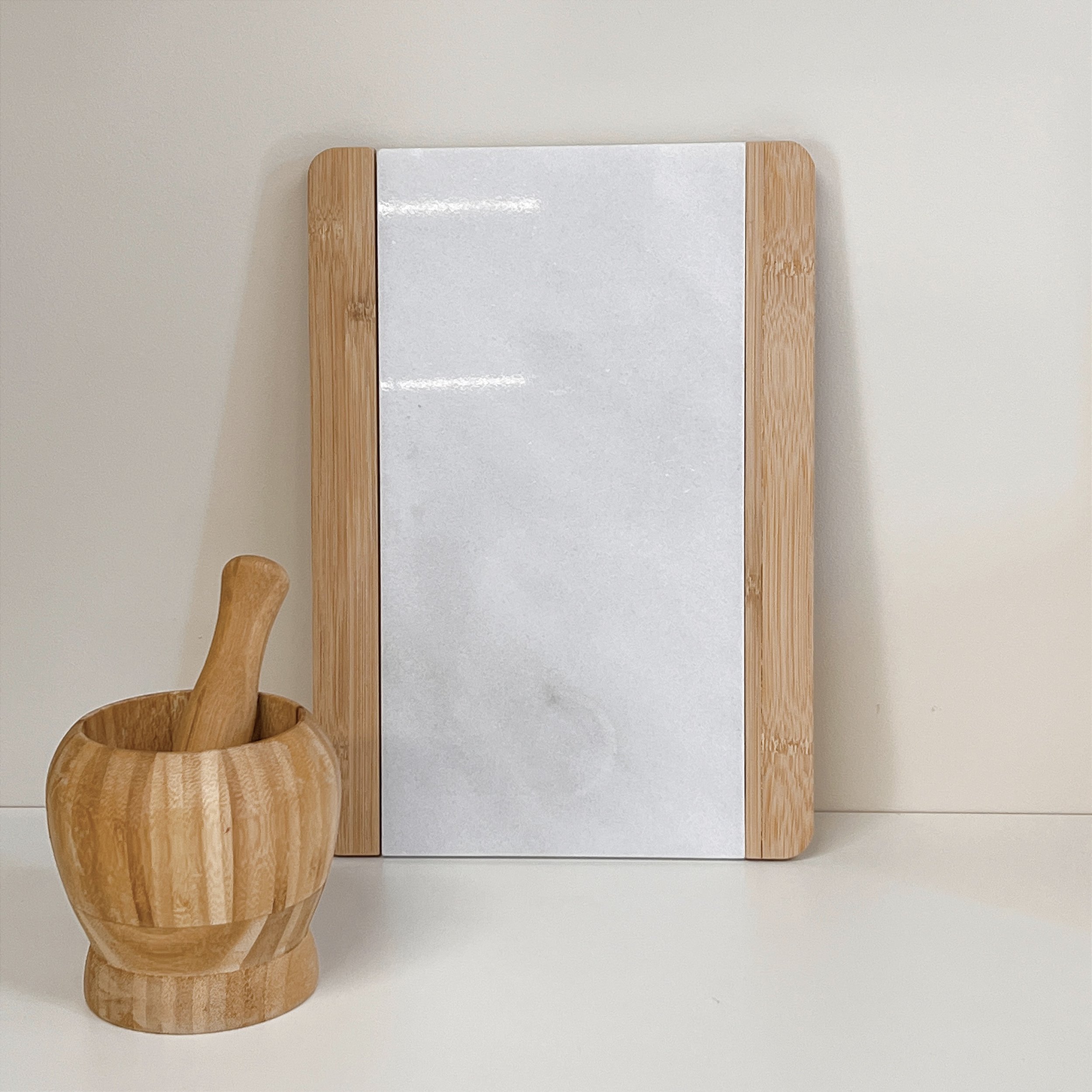 BANDEJA DE MÁRMORE COM MOLDURA DE BAMBU