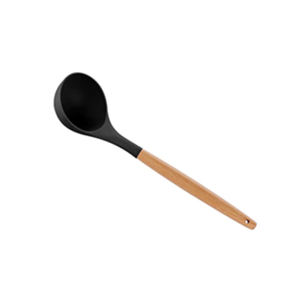 Colher de silicone com cabo em bambu preto, trazendo o melhor do estilo escandinavo para sua cozinha. Sucesso na cozinha gourmet e também na decoração.