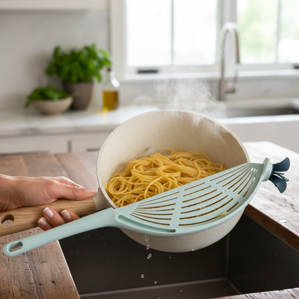 Prático e fácil de usar! Basta encaixar na borda da panela para escorrer macarrão, legumes e outros alimentos com segurança, sem precisar de escorredor grande. Leve, resistente e perfeito para facilitar o dia a dia na cozinha.