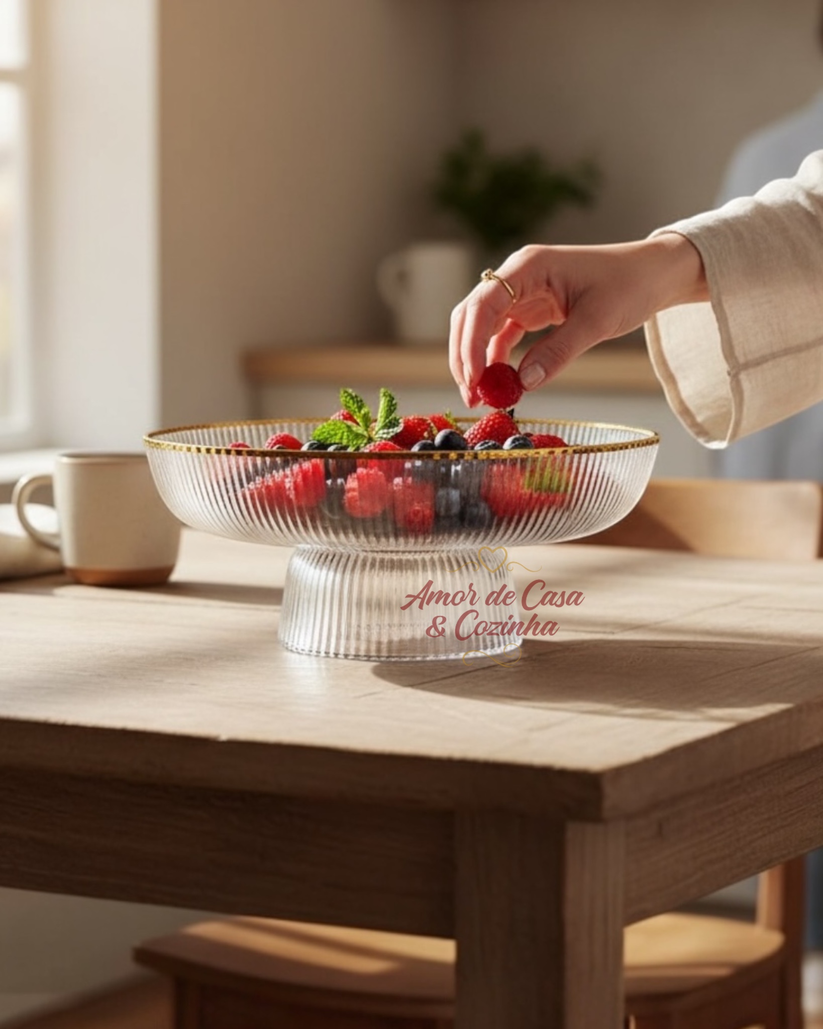 FRUTEIRA E CENTRO DE MESA VIDRO BORDA DOURADA GRAFIATO
