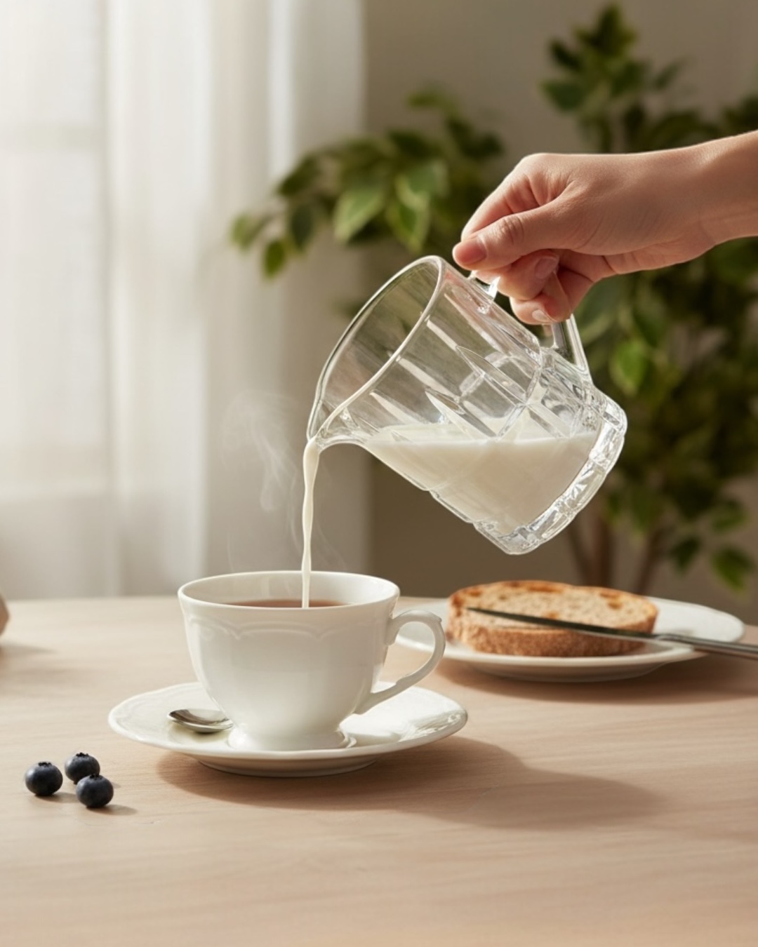 Delicada jarra de vidro com detalhes em toda sua circunferência. Peça ideal para compor com charme sua mesa posta