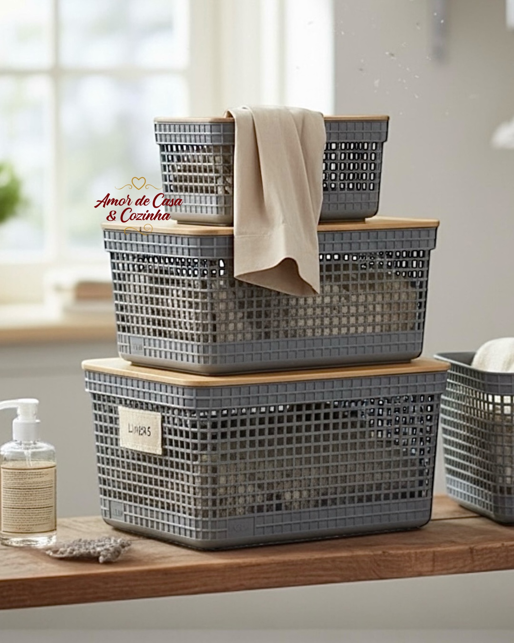 JOGO CESTOS GRID COM TAMPA DE BAMBU 3UN