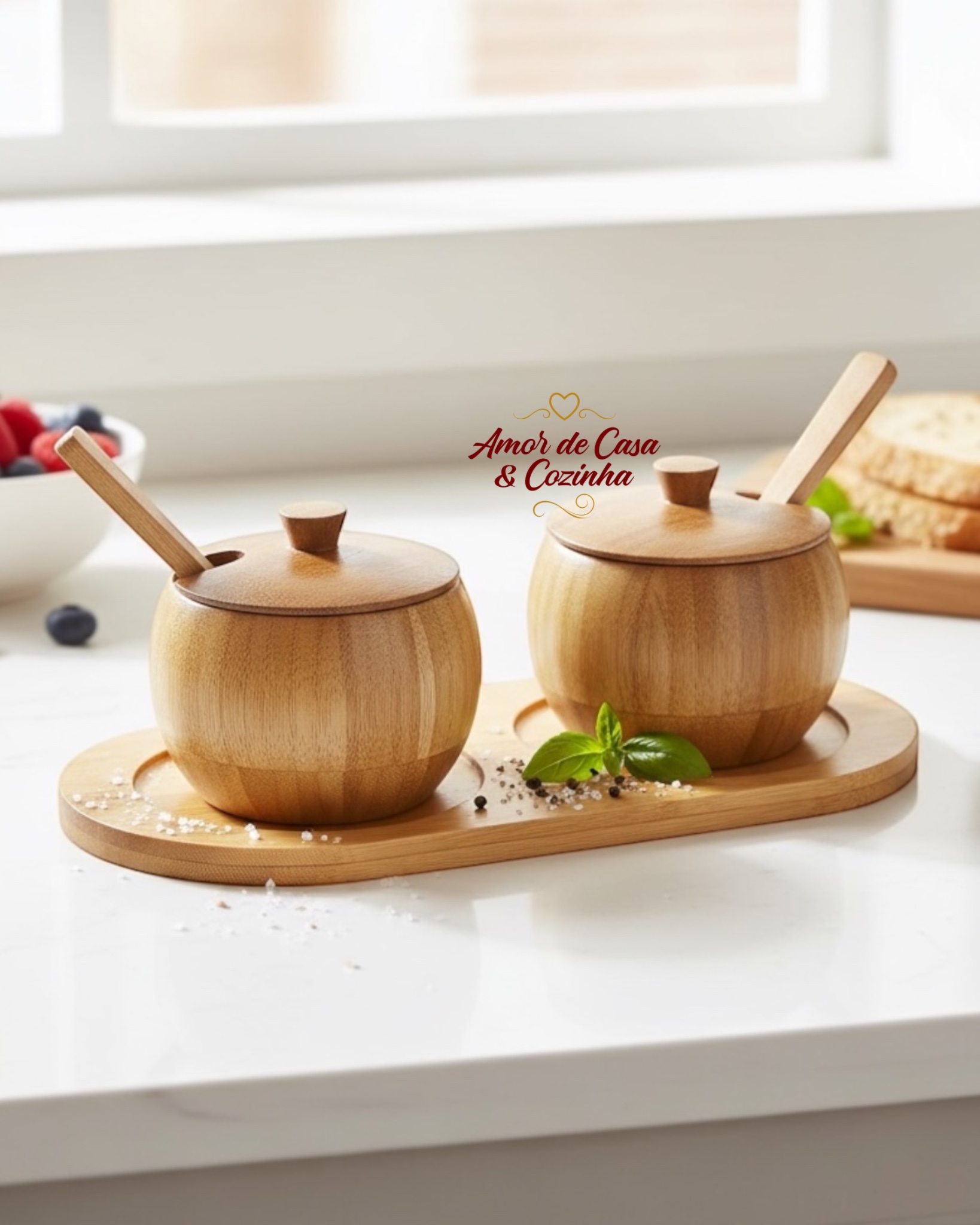 Contém : 1 Bandeja , 2 colher , 2 potes com tampa de bambu