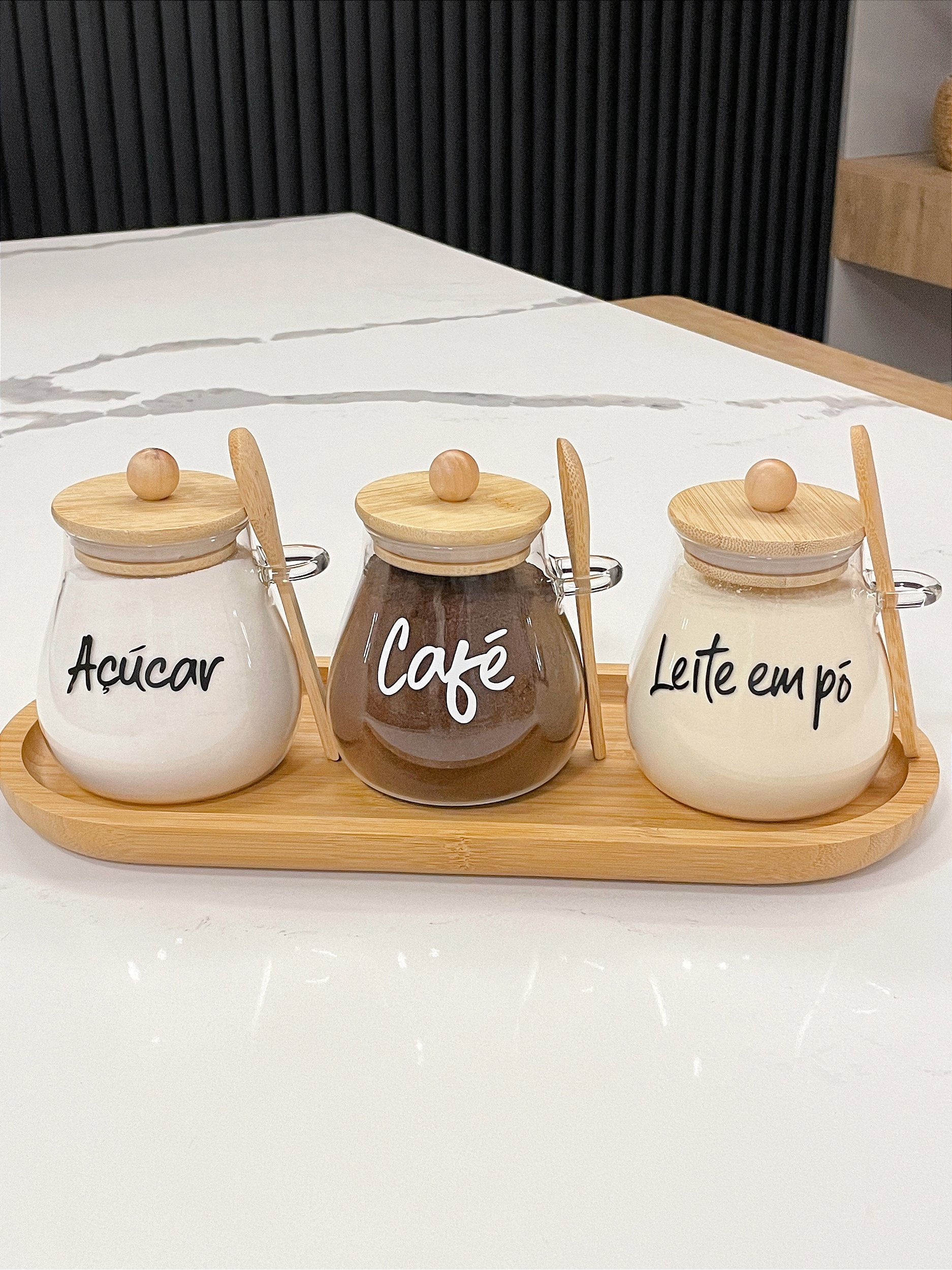 KIT 3 POTES COM COLHER E BANDEJA DE BAMBU