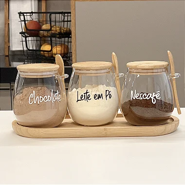 Contém: 3 potes de vidro borossilicato com colher e tampa de bambu