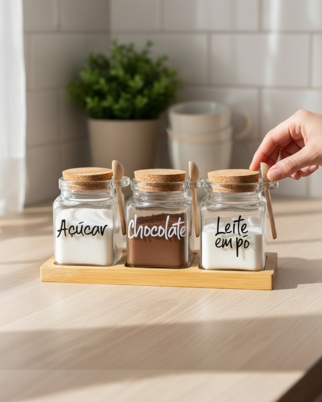 KIT BANDEJA E 3 POTES DE VIDRO QUADRADO COM COLHER E TAMPA DE ROLHA 310 ML