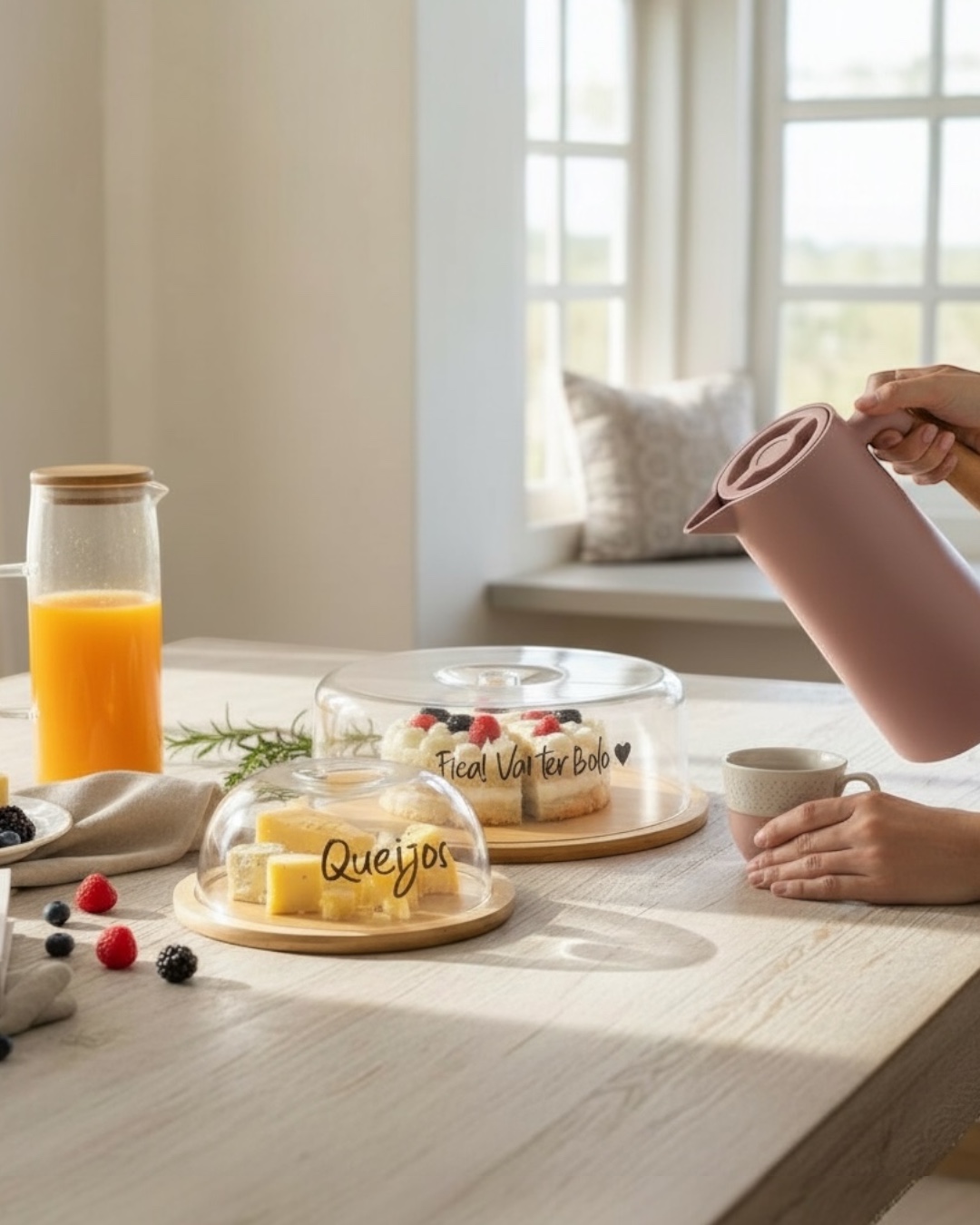 ATENÇÃO, A VARIAÇÃO DE COR SE REFERE A GARRAFA TÉRMICA E A PERSONALIZAÇÃO A BOLEIRA E QUEIJEIRA.