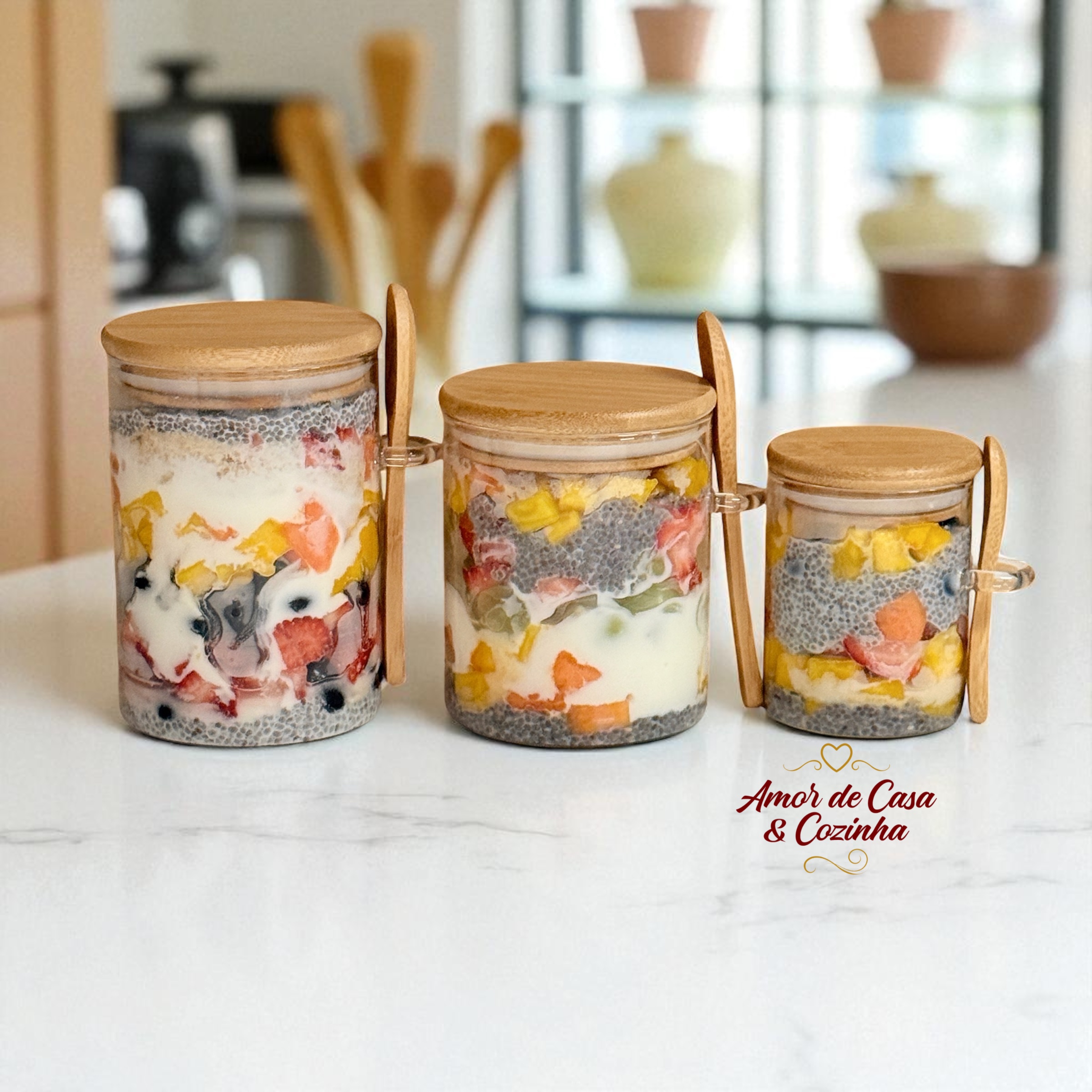 Pote de vidro hermético com tampa e colher de bambu com estilo único!