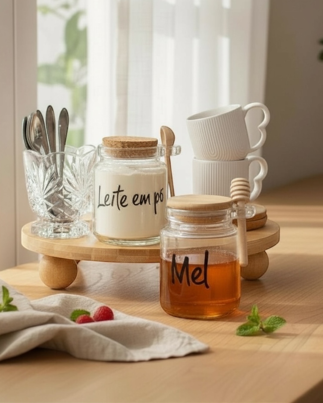 Contém: Dois potes.1 Meleira com tampa 1 pegador de bambu. 1 Pote tampa de cortiça.