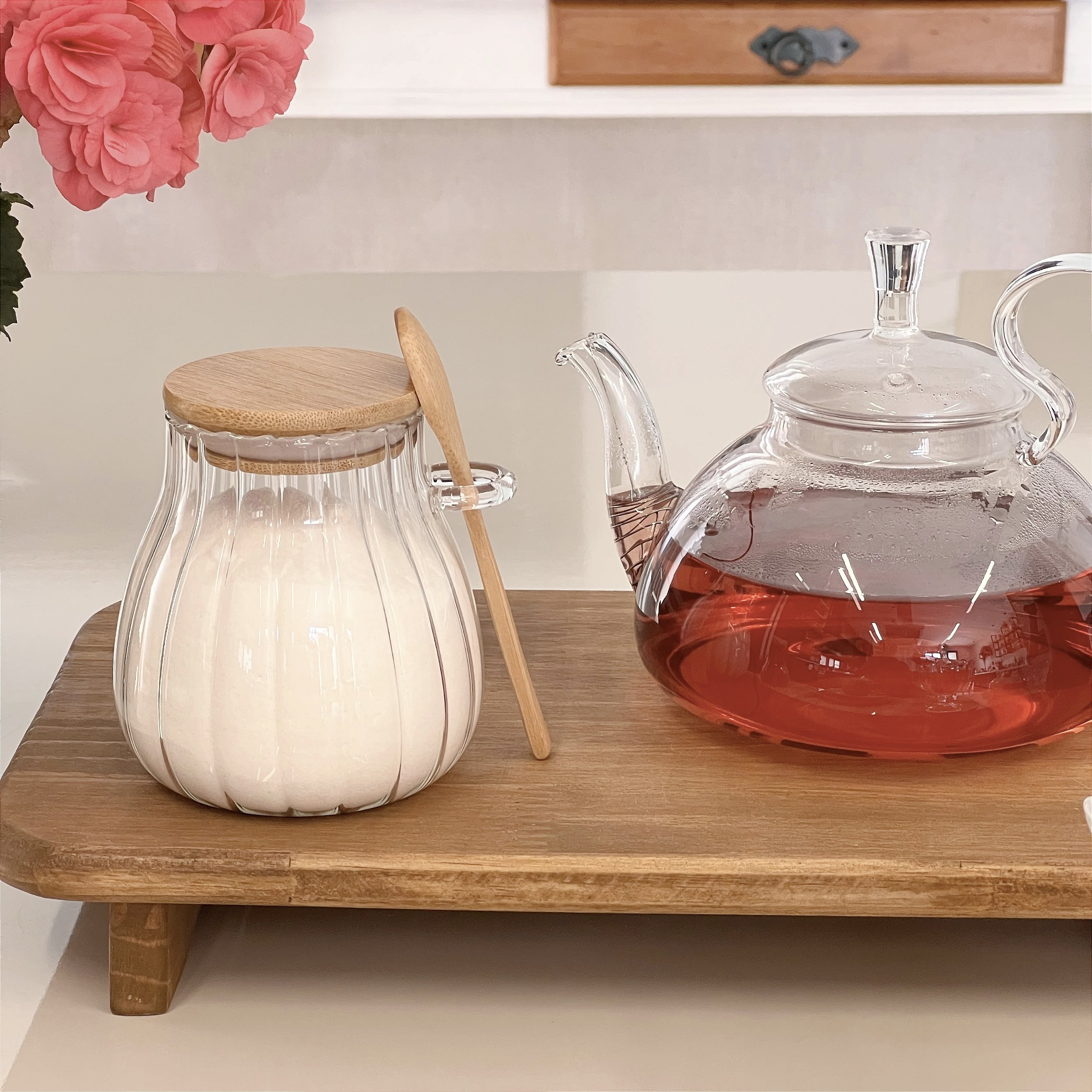 Pote de vidro borossilicato hermético com colher e tampa de bambu com suporte lateral para armazenar a colher.