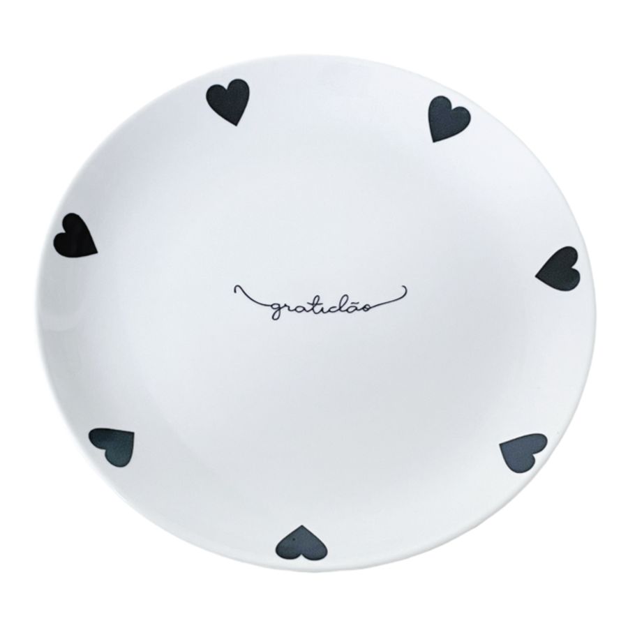 Prato de sobremesa com design exclusivo Linha Corações é perfeito para compor sua mesa posta e servir. Em porcelana, é altamente durável, higiênico, de fácil limpeza e pode ser levado ao microondas e máquina de lavar louças. Com o prato de sobremesa escrita gratidão e detalhes de coração preto você irá servir com muito mais elegância, requinte e sofisticação. Transforme a hora das suas tradicionais refeições em um momento muito memorável.