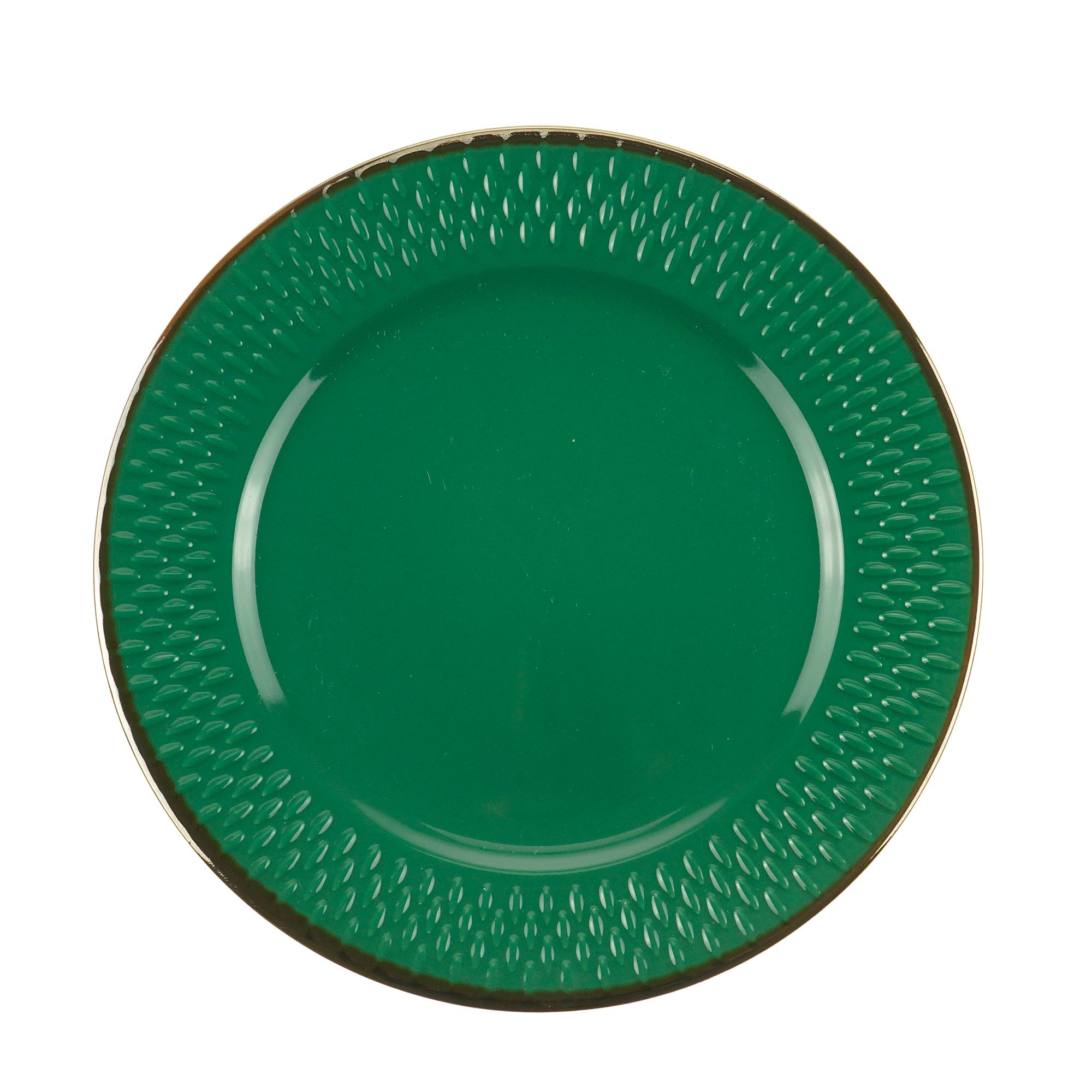 Delicado prato para sobremesa de porcelana na cor verde, com detalhes em alto relevo e faixa dourada em toda sua circunferência. Perfeito para servir em uma mesa posta.