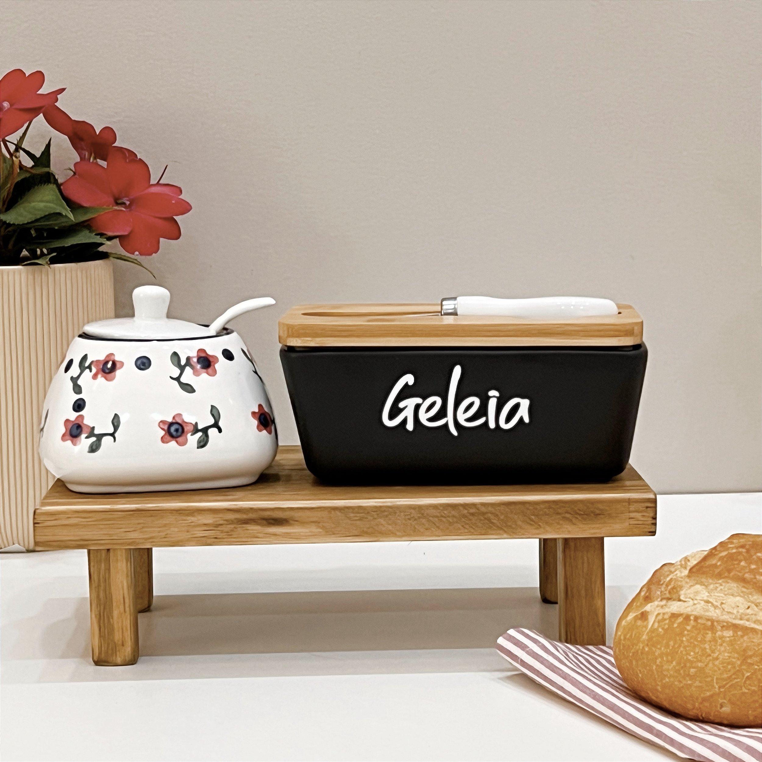 O porta manteiga /geléias é um recipiente para armazenar e facilitar o acesso na hora do uso.
