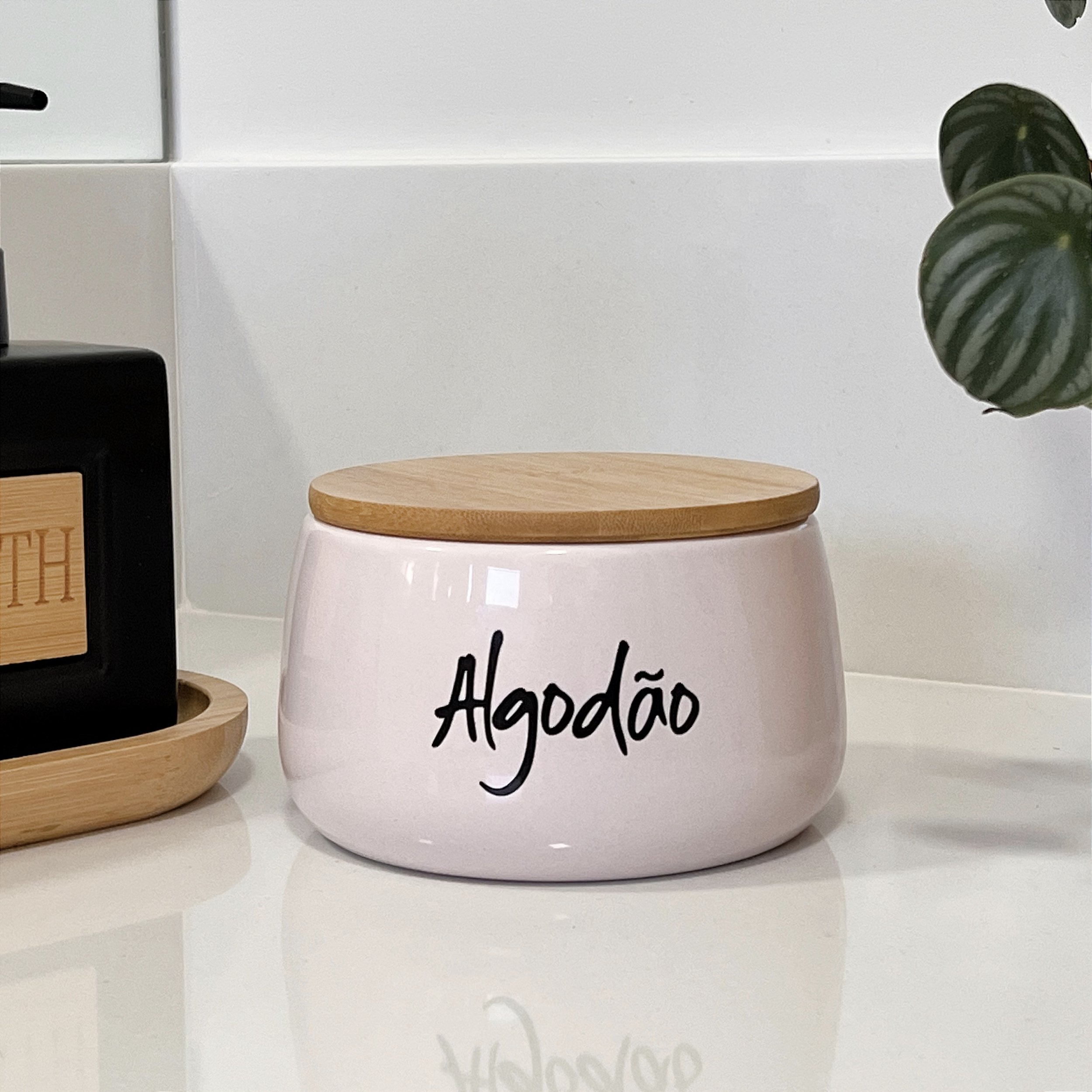 PORTA ALGODÃO DE CERÂMICA ROSA COM TAMPA DE BAMBU