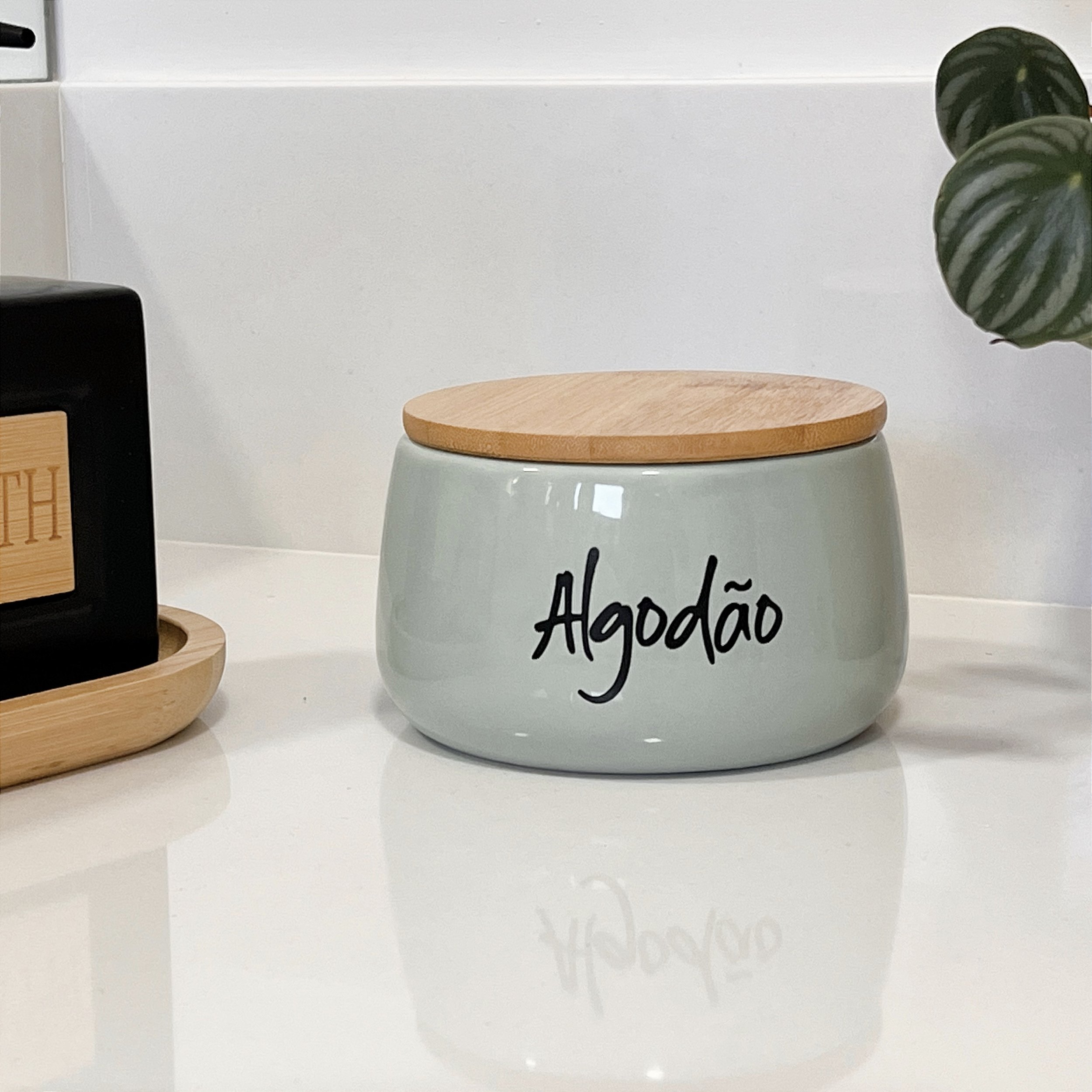 PORTA ALGODÃO DE CERÂMICA VERDE COM TAMPA DE BAMBU