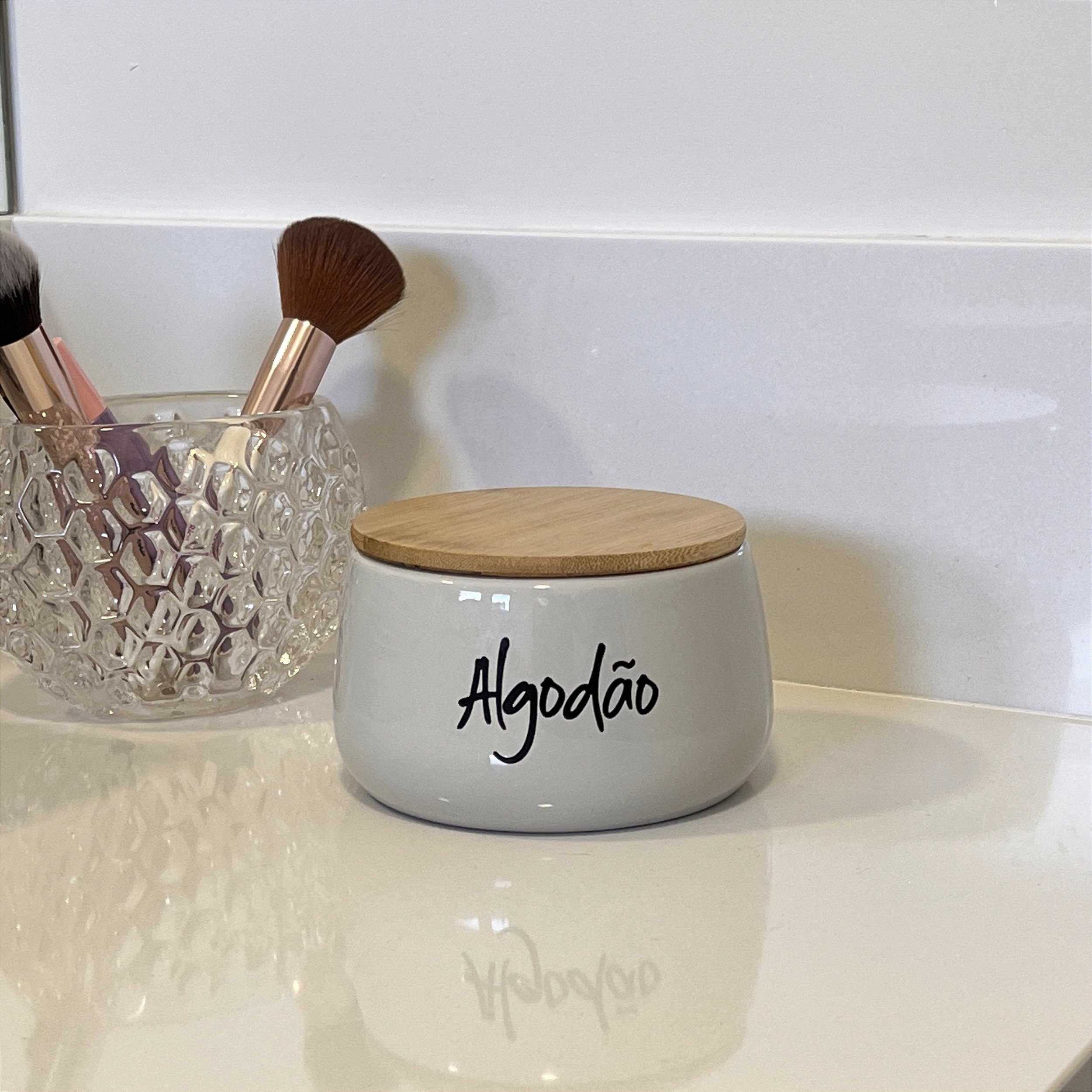 PORTA ALGODÃO DE CERÂMICA NUDE COM TAMPA DE BAMBU